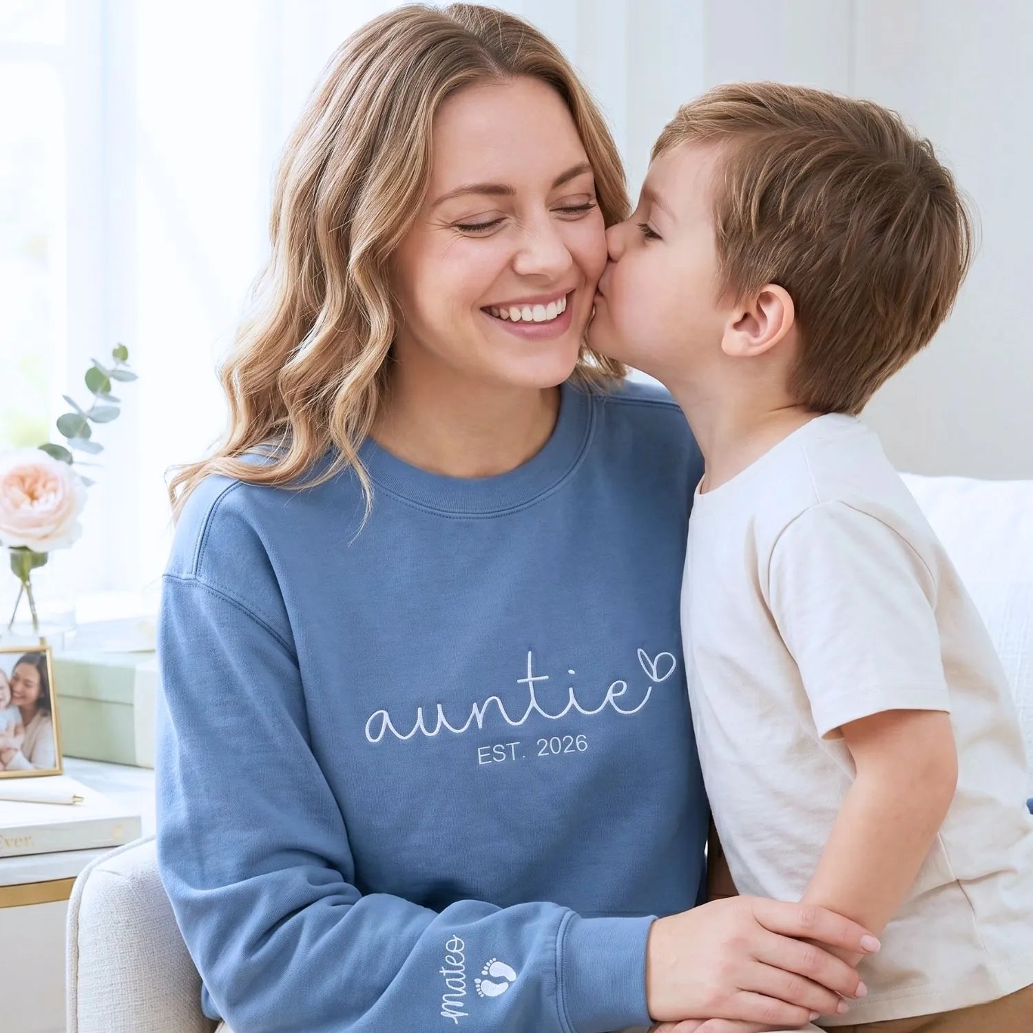 Designed to be both stylish and meaningful, each piece features a beautifully stitched “Aunt” title on the front and personalized kids’ names on the sleeve, creating a keepsake she’ll cherish every day. Perfect as a thoughtful gift from nephews and nieces, this cozy and versatile apparel suits birthdays, holidays, or just-because moments.