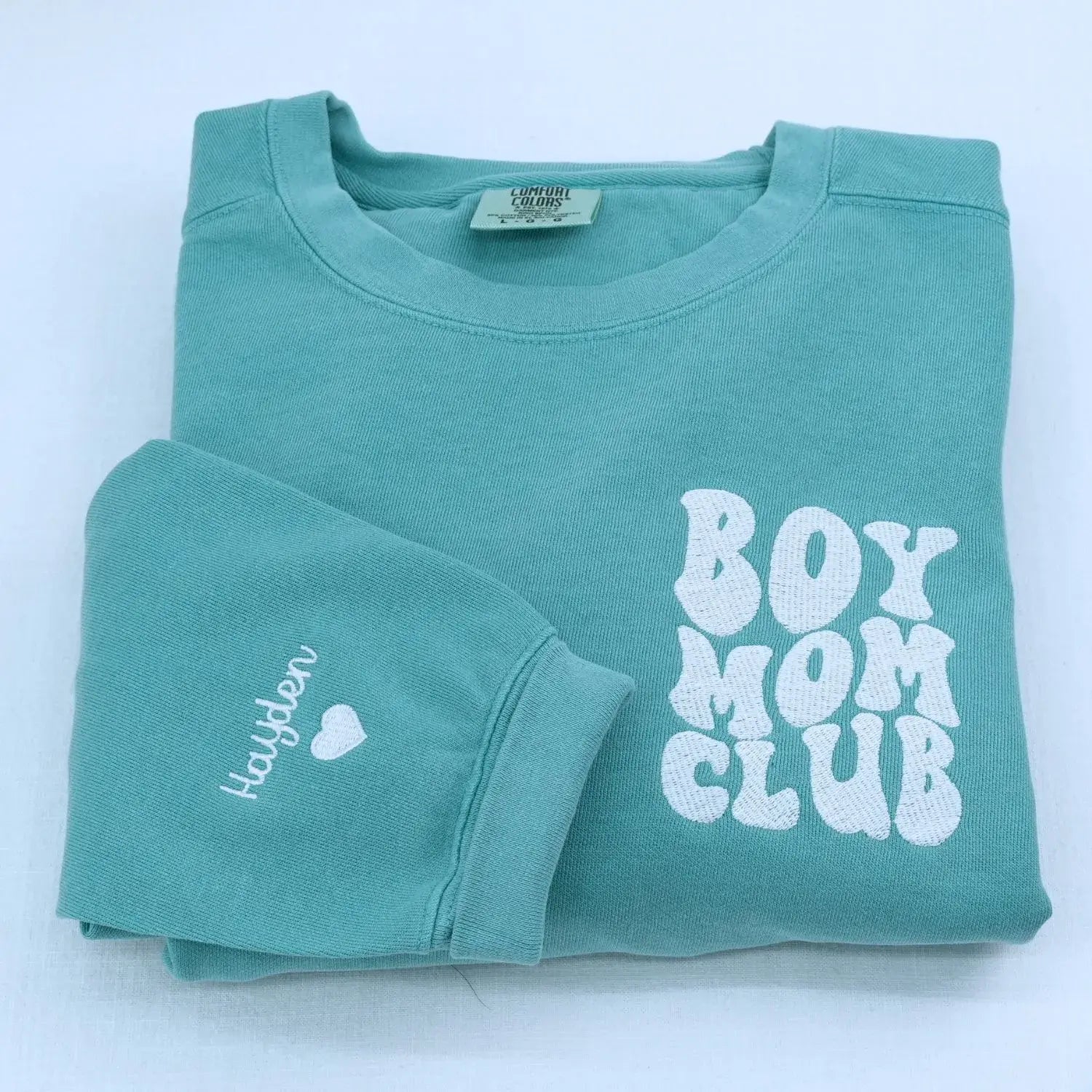 With “Boy Mom Club” stitched proudly on the chest and her sons’ names embroidered down the sleeve, this piece is more than comfy apparel—it’s a badge of honor she’ll wear with pride.