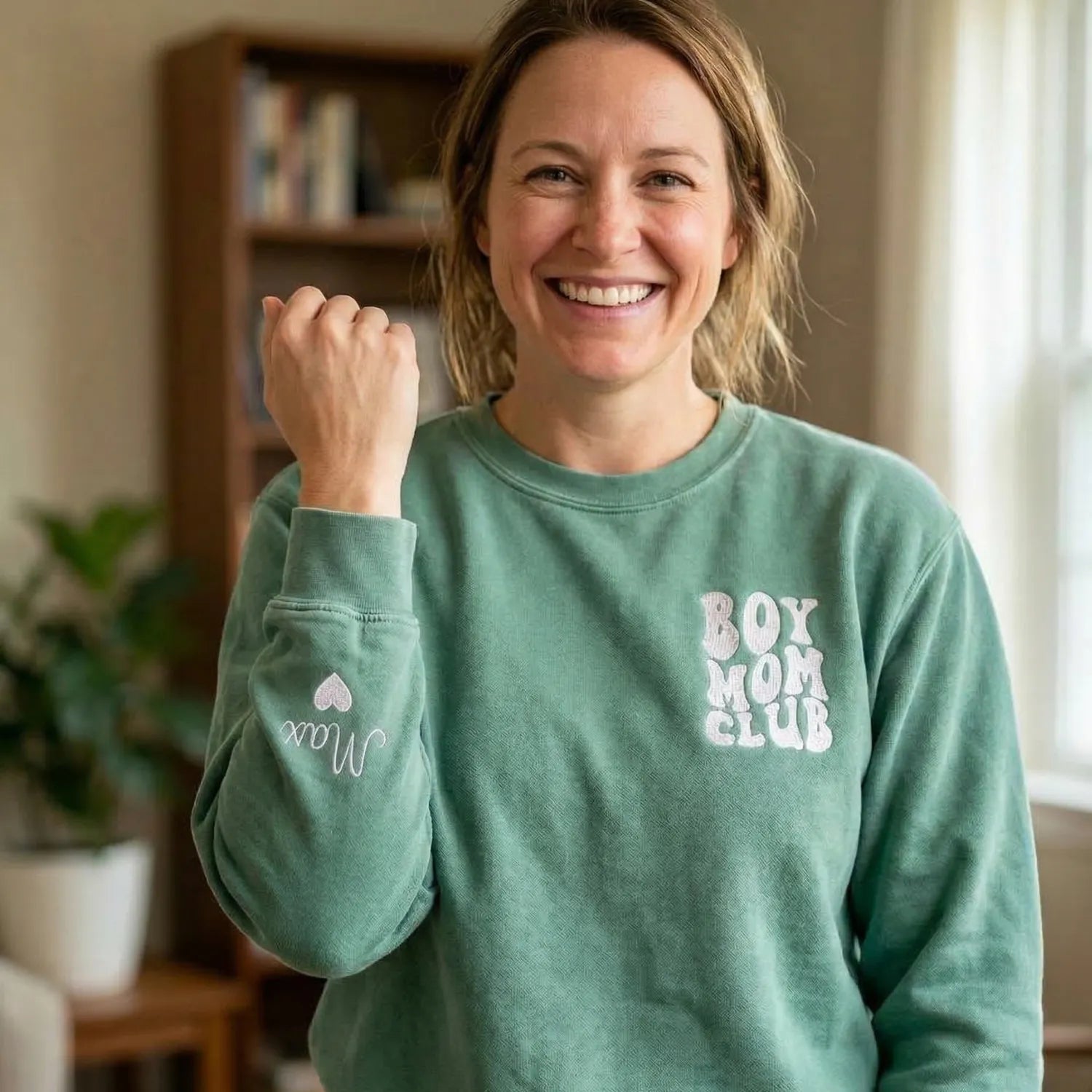 With “Boy Mom Club” stitched proudly on the chest and her sons’ names embroidered down the sleeve, this piece is more than comfy apparel—it’s a badge of honor she’ll wear with pride.