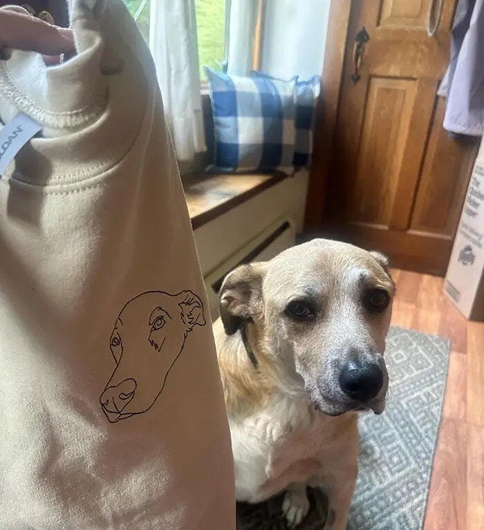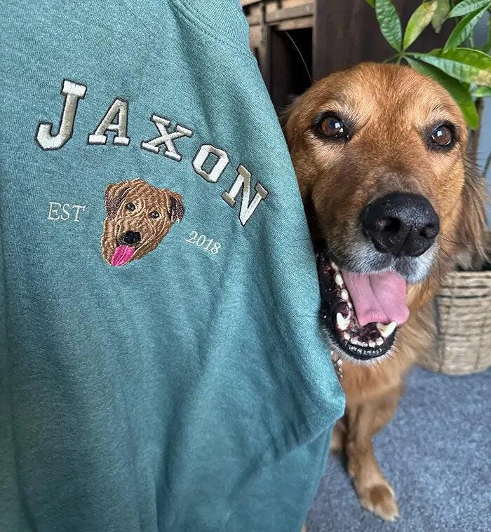 “He walks that dog like it’s a parade, so I figured, so I figured—why not get him a sweatshirt that shows off the real boss? I uploaded a few pics, Embroly picked the best one, and boom. It’s his new favorite thing to wear.”