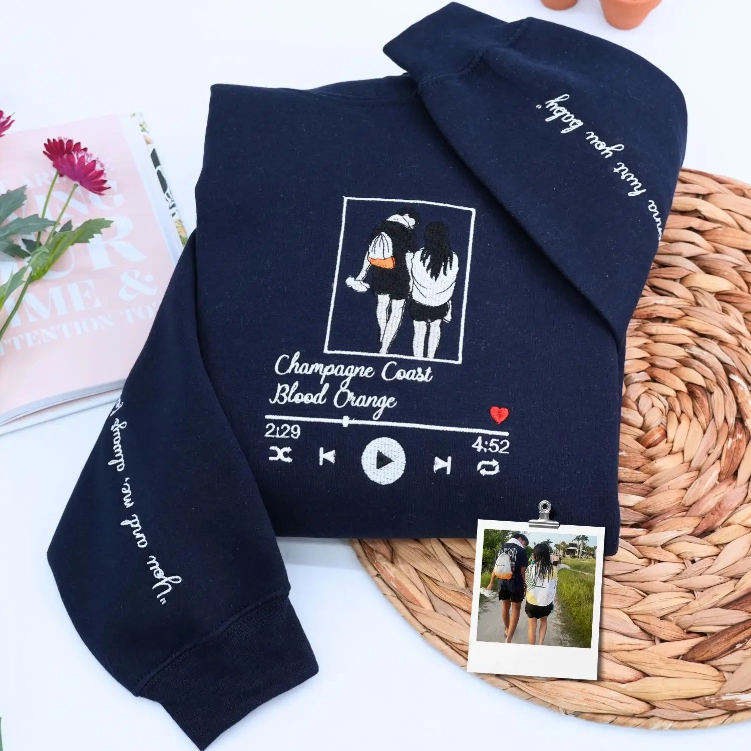 Celebrate your love story with our Custom Embroidered Portrait Photo with Favorite Song Sweatshirt. This one-of-a-kind sweatshirt features a beautifully embroidered portrait of your favorite photo paired with the title of your favorite song displayed in a classic play-screen design. This sweatshirt is a unique way to keep cherished memories close, perfect for Valentine's Day or any special occasion. Made from premium, soft fabric, it's as comfortable as it is meaningful, making it an ideal gift for your loved one.
