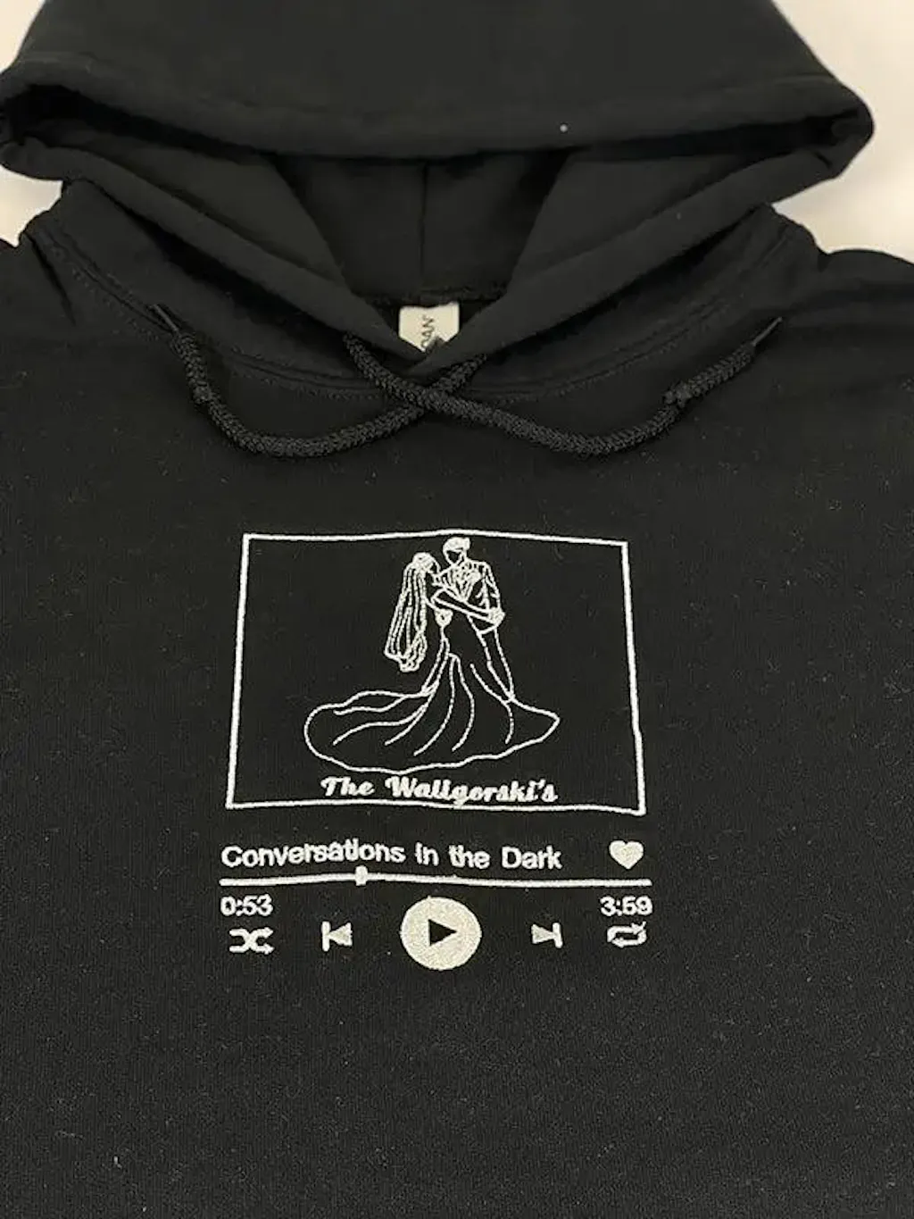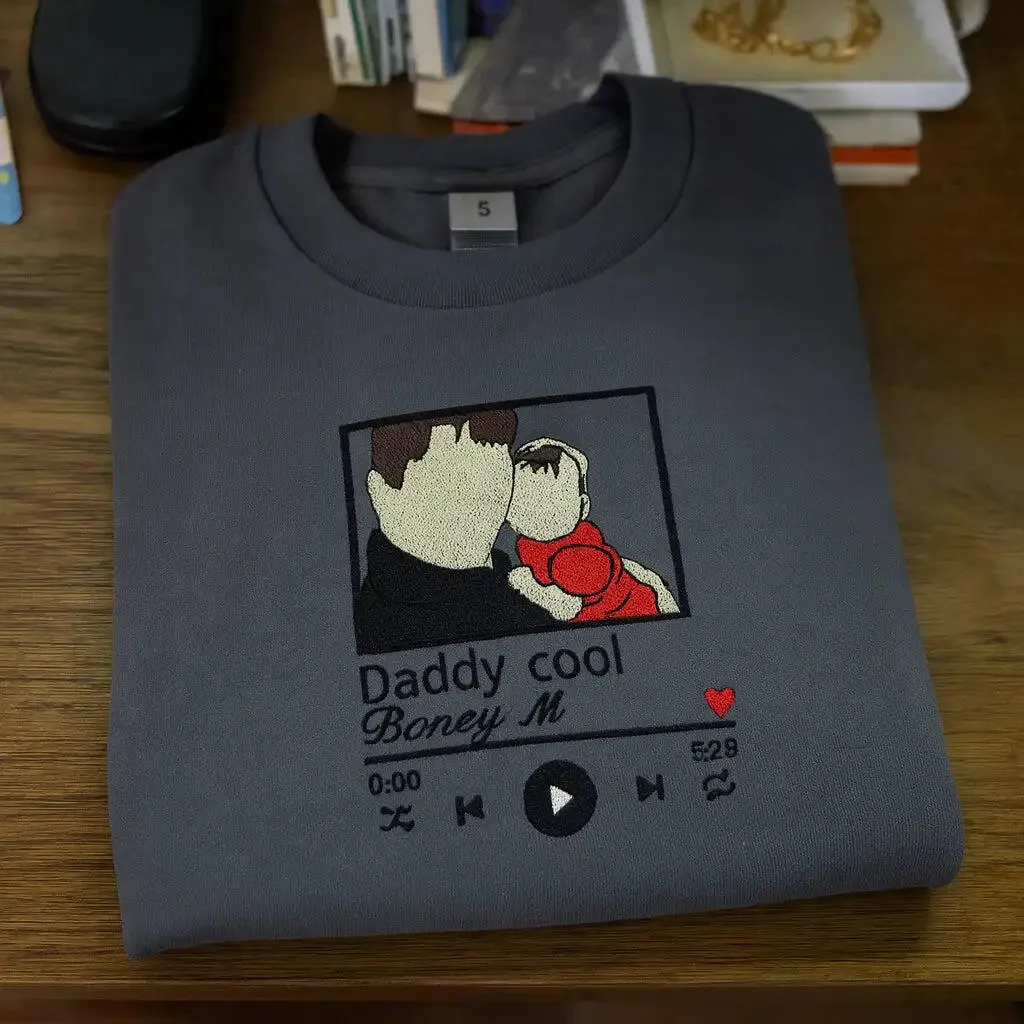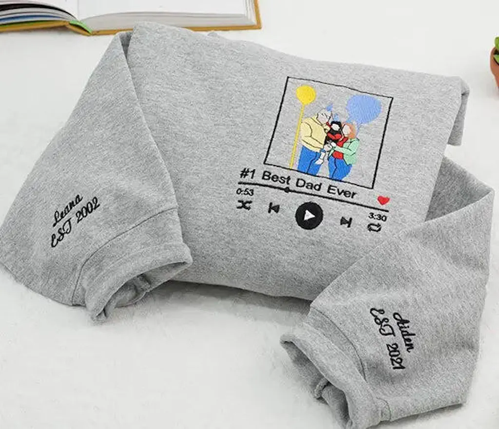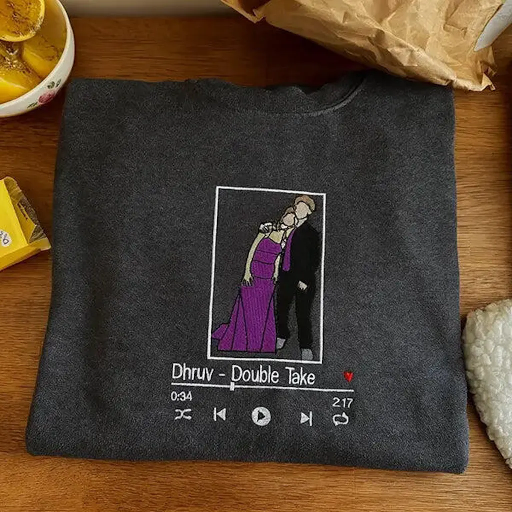 Celebrate your love story with our Custom Embroidered Portrait Photo with Favorite Song Sweatshirt. This one-of-a-kind sweatshirt features a beautifully embroidered portrait of your favorite photo paired with the title of your favorite song displayed in a classic play-screen design. This sweatshirt is a unique way to keep cherished memories close, perfect for Valentine's Day or any special occasion. Made from premium, soft fabric, it's as comfortable as it is meaningful, making it an ideal gift for your loved one.