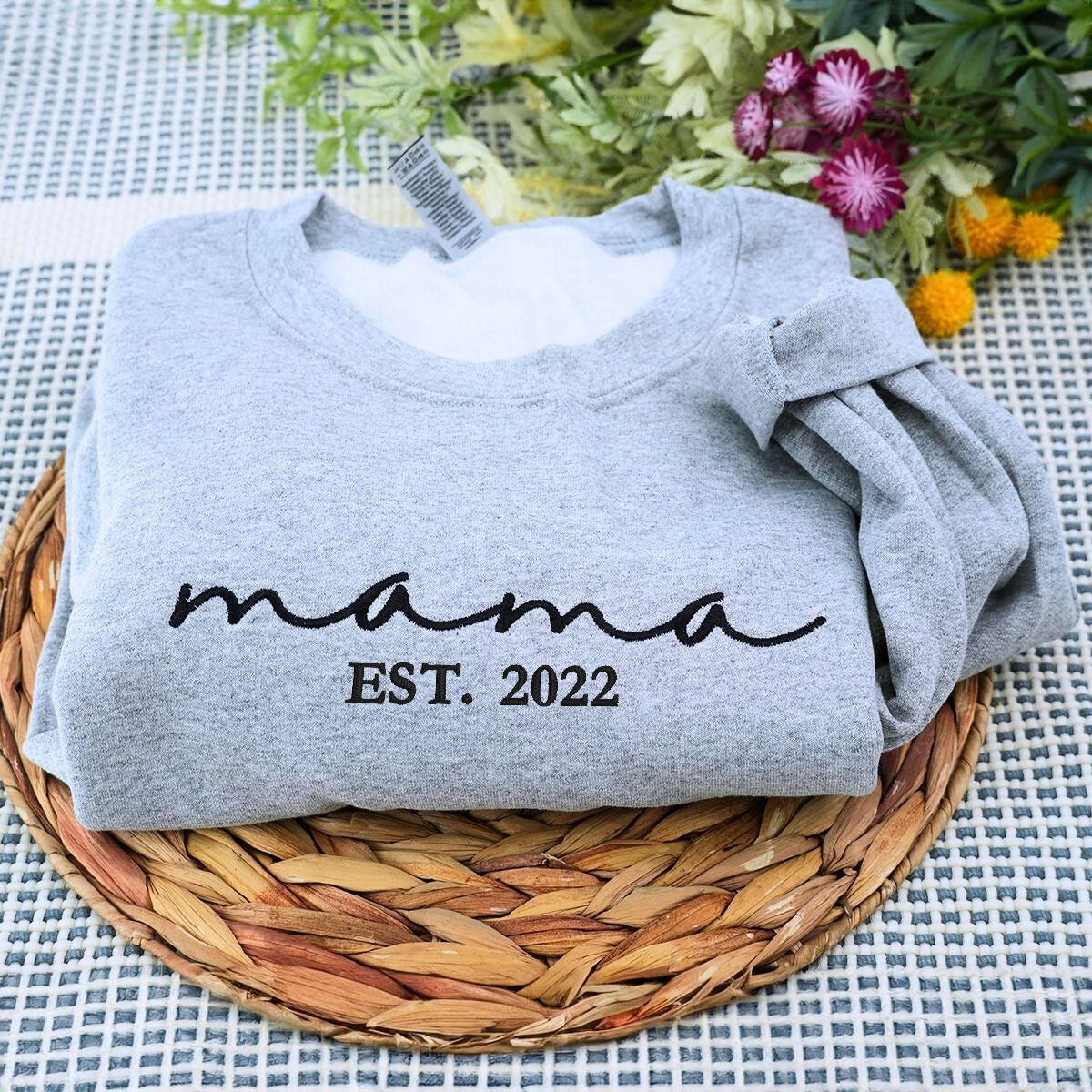 Wrap love and comfort into one with our custom embroidered Mama sweatshirt – a timeless gift that celebrates motherhood in style. Made with premium cotton-blend fabric, this cozy sweater is embroidered with “Mama” and your personalized Est. year or name on the sleeve, making it truly one-of-a-kind.