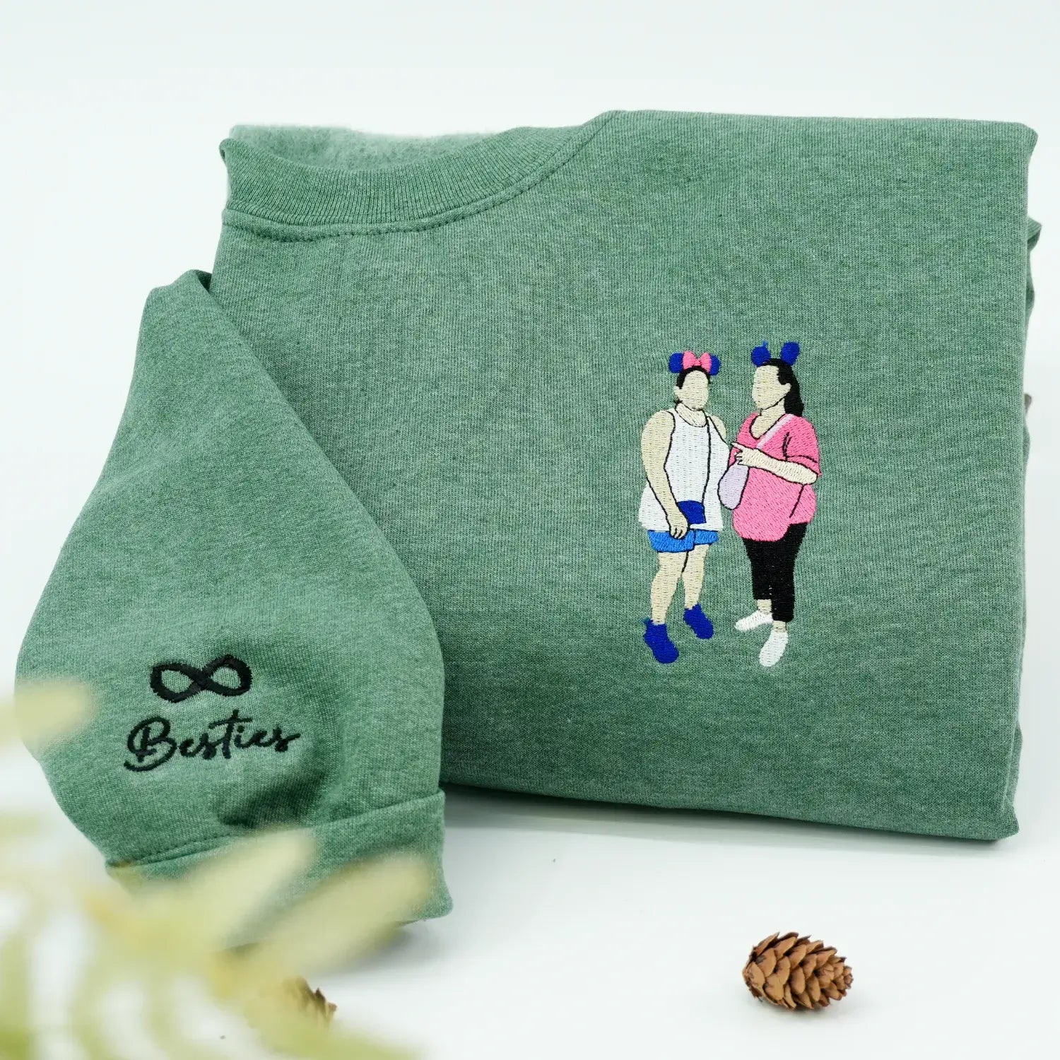 Make your bond unforgettable with our custom embroidered bestie sweatshirts. Designed for two, these cozy matching hoodies let you showcase your friendship in a truly personal way — whether it's your favorite photo, your names, or your EST year embroidered right on the sleeve.