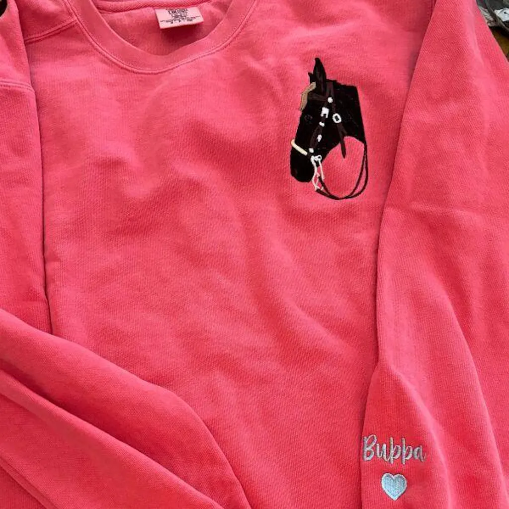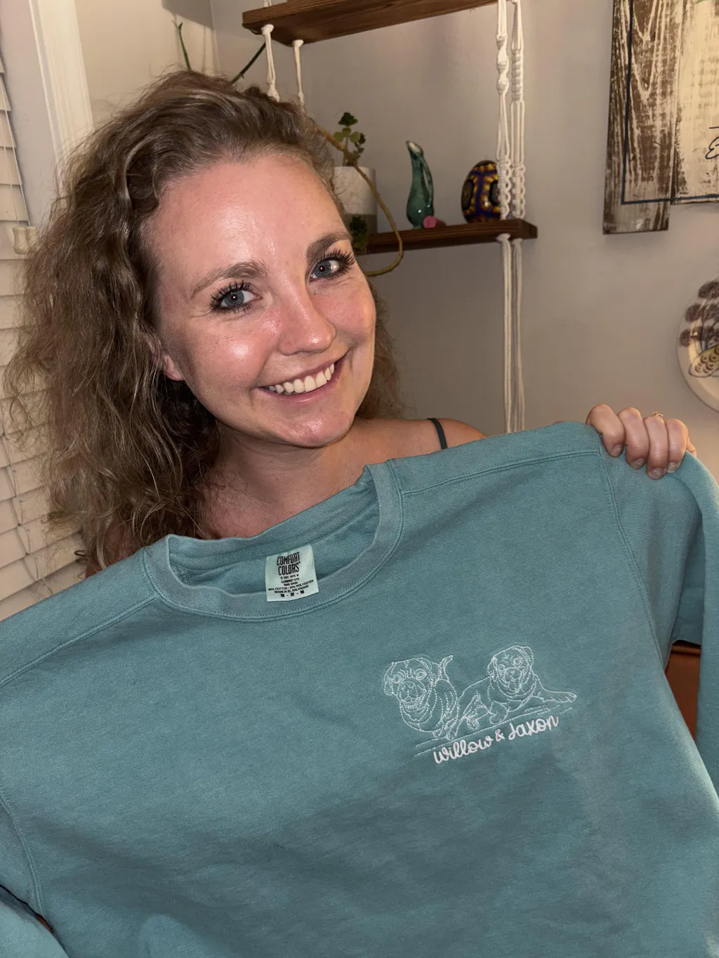 The Embroidered Dog Face and Dog Name Sweatshirt is a delightful item for dog lovers. This sweatshirt features a detailed embroidered dog's face, accompanied by their name. It's ideal to wear the dog embroidered sweatshirt for casual wear, dog walks, or lounging at home. On Embroly.com, you can choose colors and customize a unique gift for yourself or any pet lovers, dog dads, dog moms, dog mamas, dog grandmas, and more.