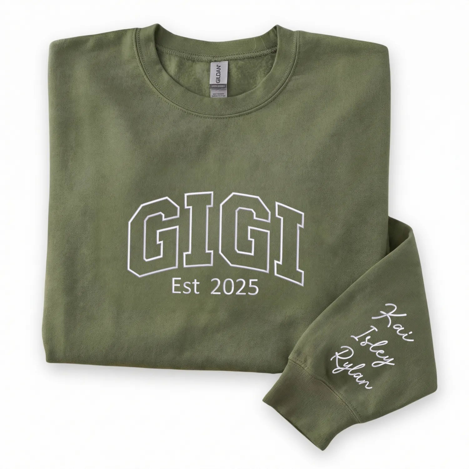 This custom embroidered Gigi sweatshirt features a classic collegiate-style GIGI design on the front along with an established year to mark when she became a proud grandmother. The sleeve can be personalized with the names of her beloved grandkids, making this sweatshirt a deeply meaningful keepsake she can wear proudly.