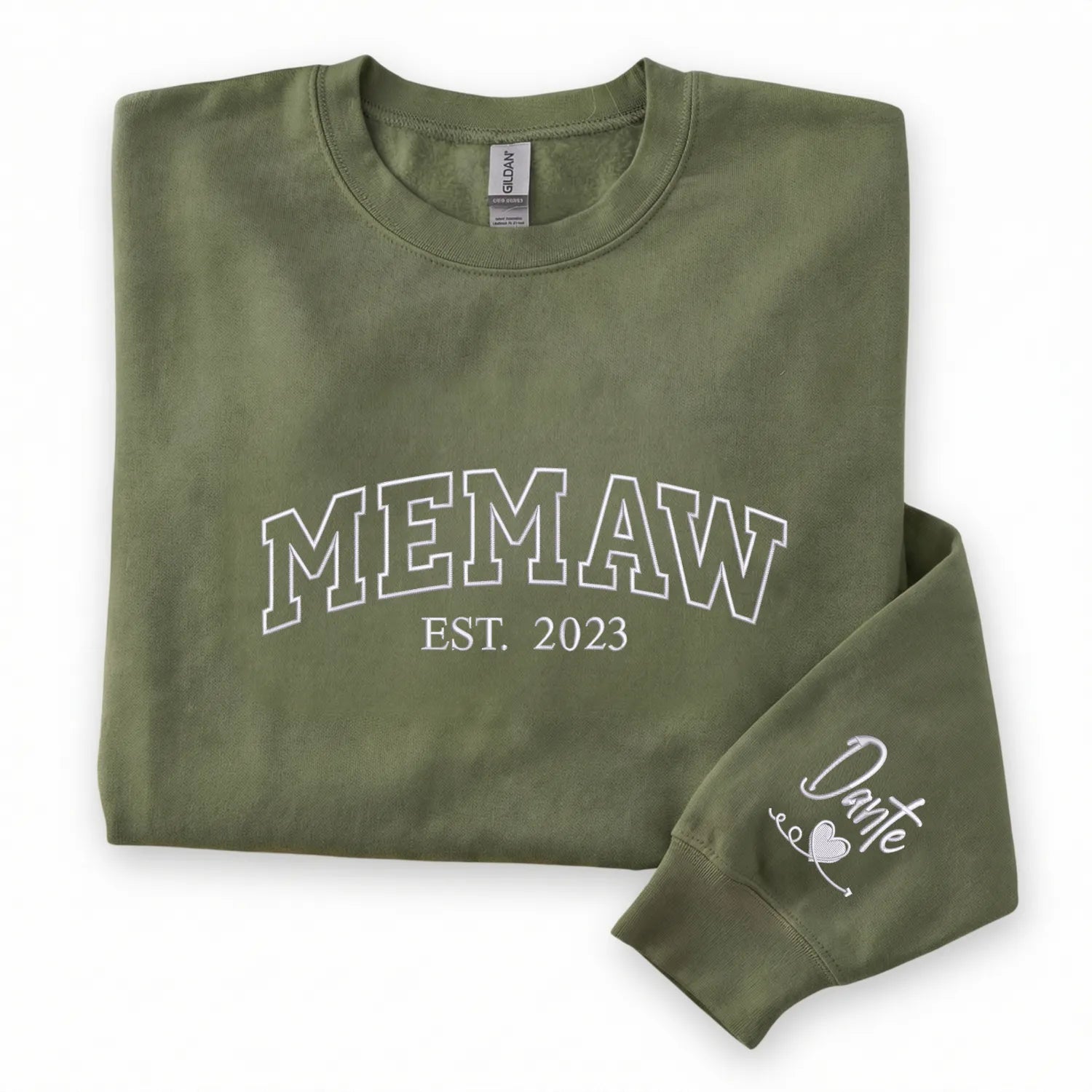 Designed for comfort and everyday wear, this cozy sweatshirt features a classic collegiate Memaw design on the front along with a custom est year. The sleeve embroidery showcases the names of the grandkids who made her a Memaw, creating a heartfelt detail that transforms this sweatshirt into a treasured keepsake. Each name is carefully embroidered to ensure durability, making this piece something she can proudly wear for years to come.