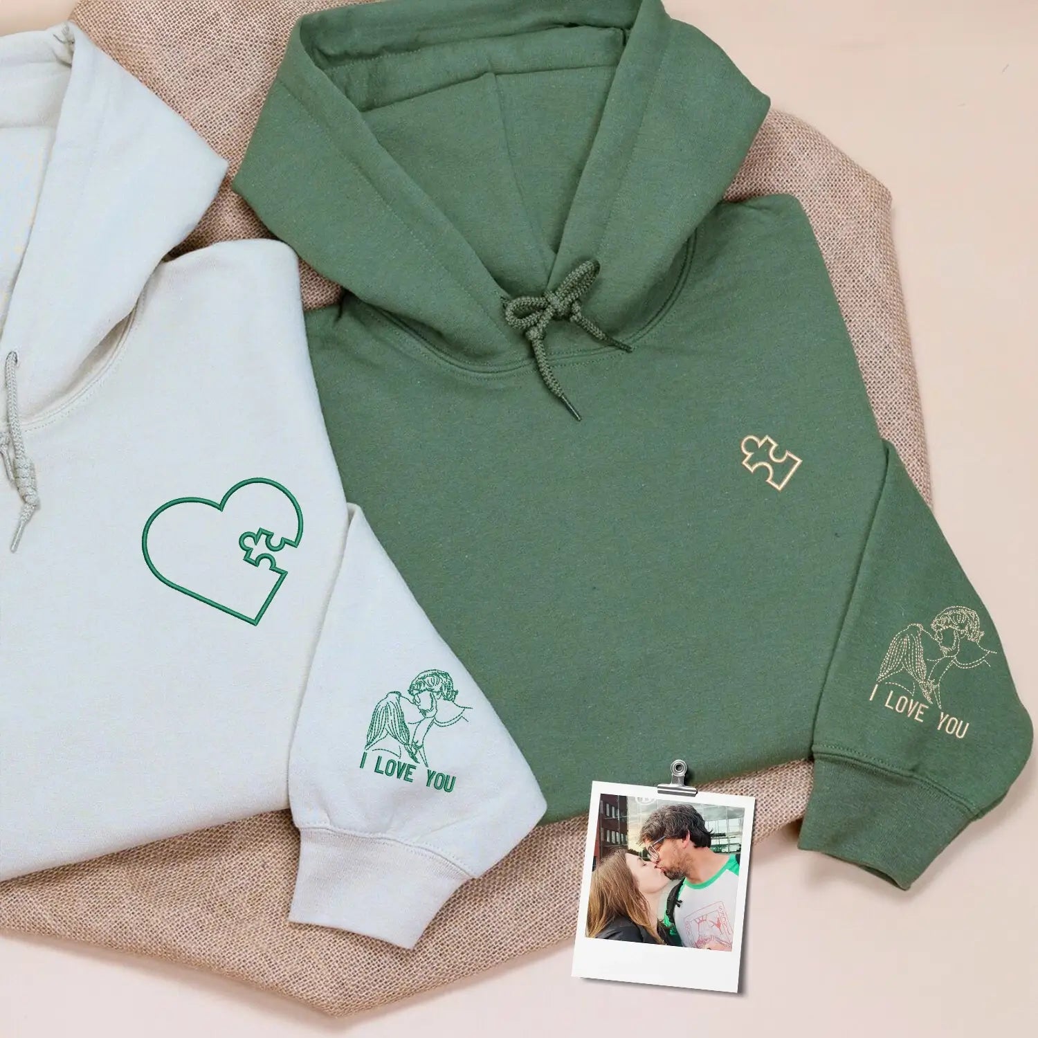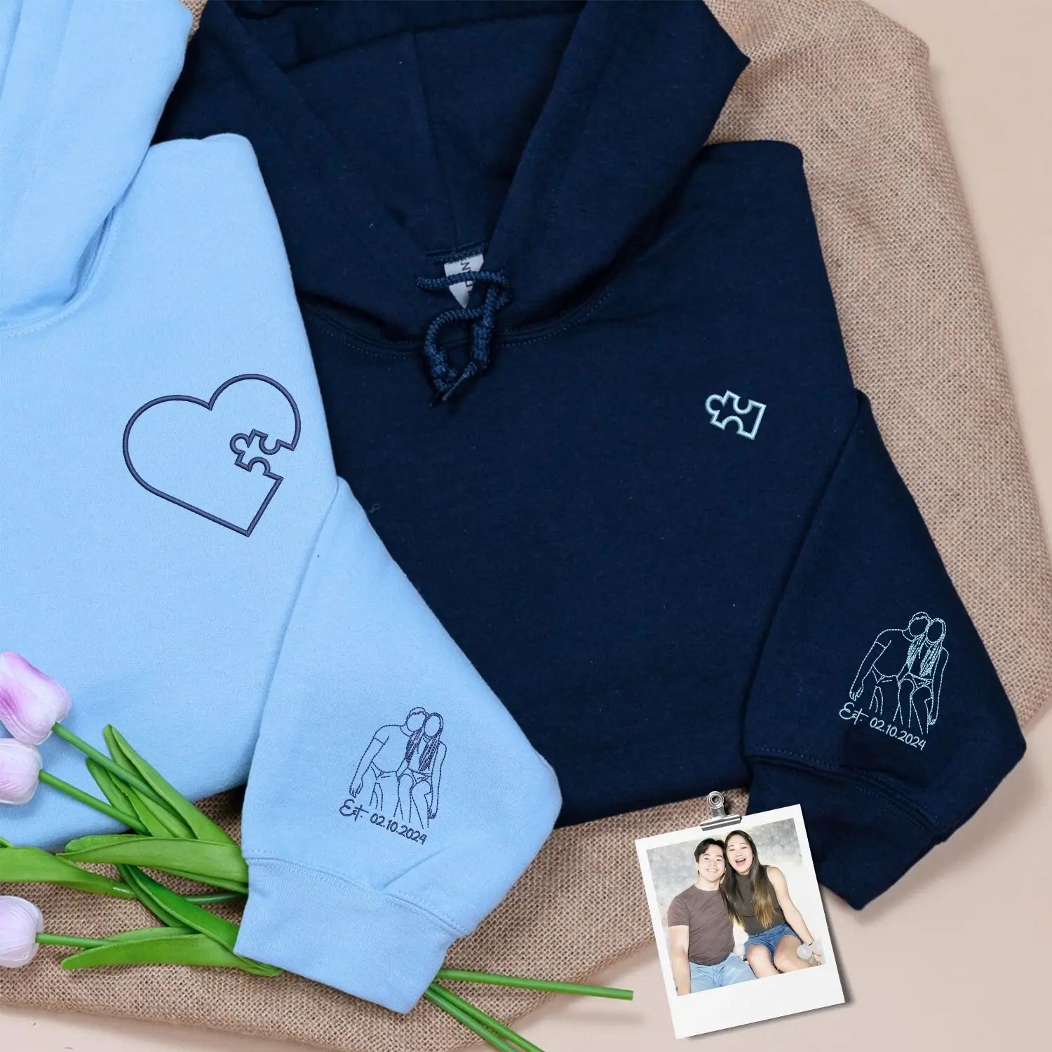 Celebrate your first wedding anniversary with a custom embroidered heart puzzle piece sweatshirt designed to tell your love story. This personalized hoodie transforms your couple portrait into a delicate embroidery, symbolizing two hearts that perfectly fit together.