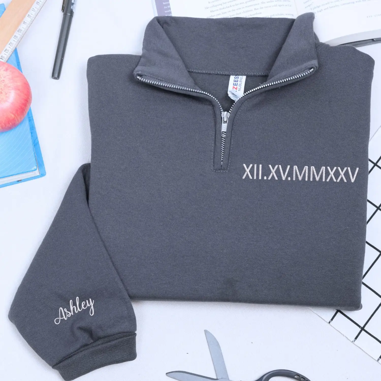 Celebrate the moment that changed everything with a personalized Roman numeral quarter zip sweatshirt, custom embroidered with your special date and initials. Designed to turn a meaningful memory into something wearable, this sweatshirt blends timeless symbolism with everyday comfort.