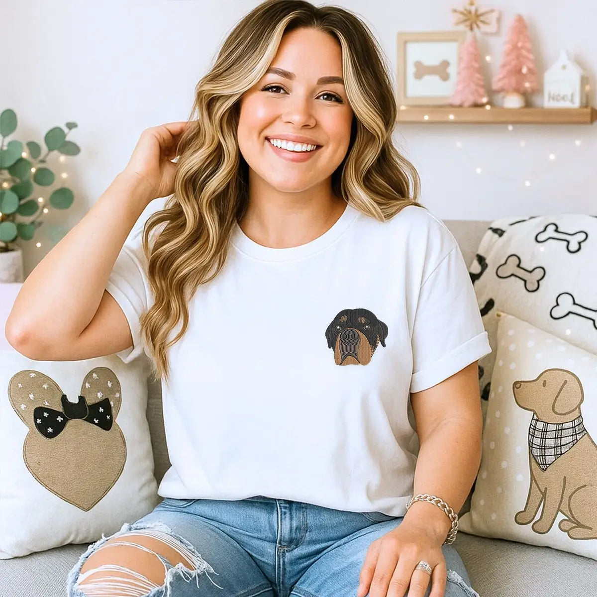 Celebrate your love for your Rottweiler with this custom embroidered Rottweiler Mom shirt. This one-of-a-kind shirt features a hand-stitched portrait of your dog's photo and your pet’s name beautifully embroidered on the sleeve — making it a heartfelt keepsake or the perfect gift for any dog mom.