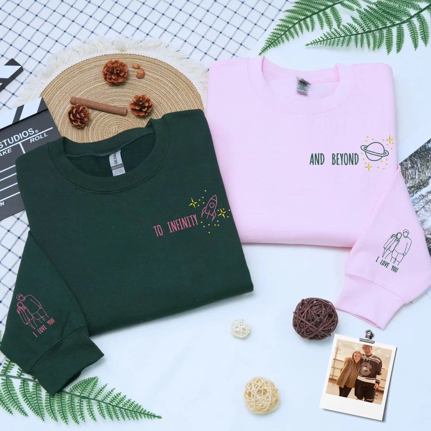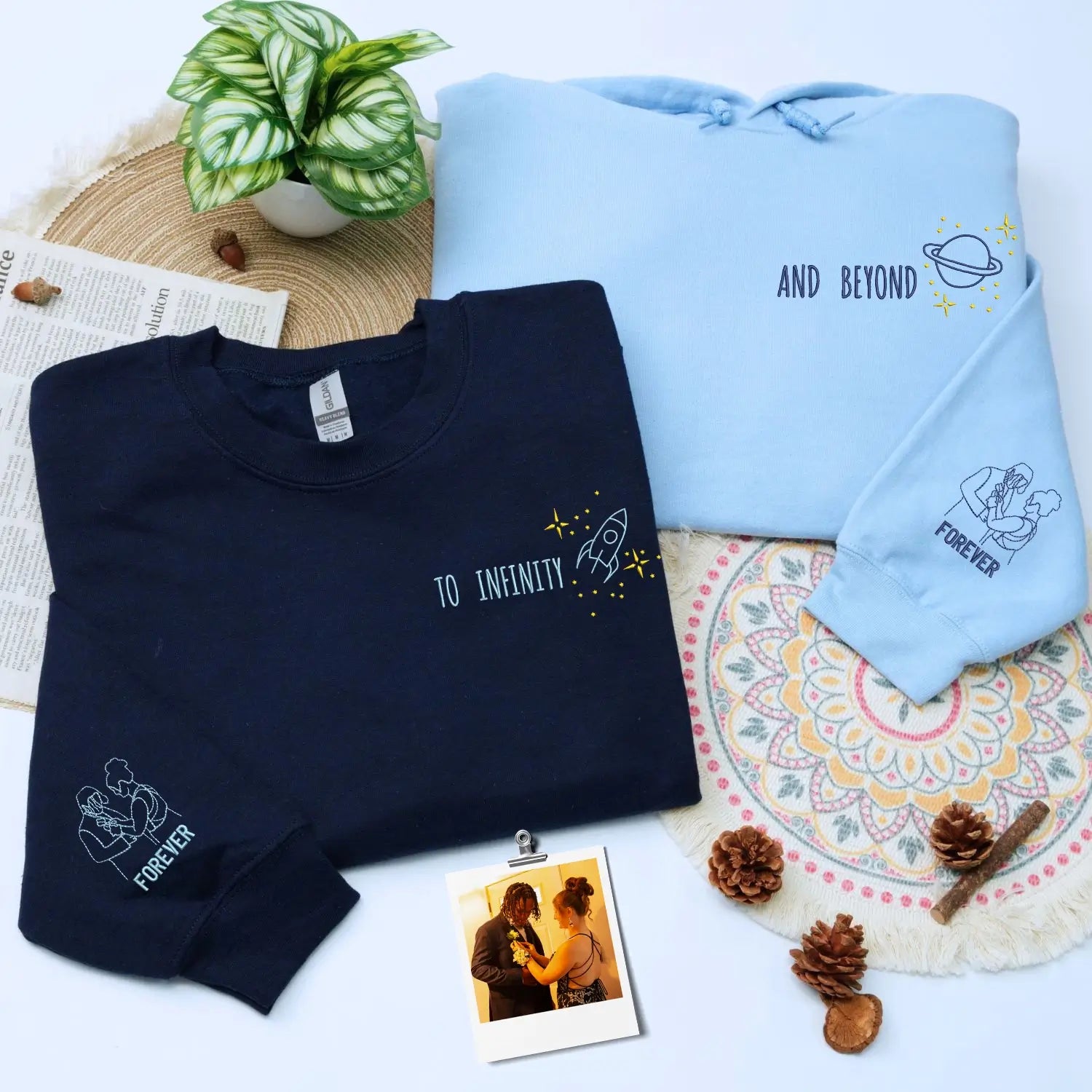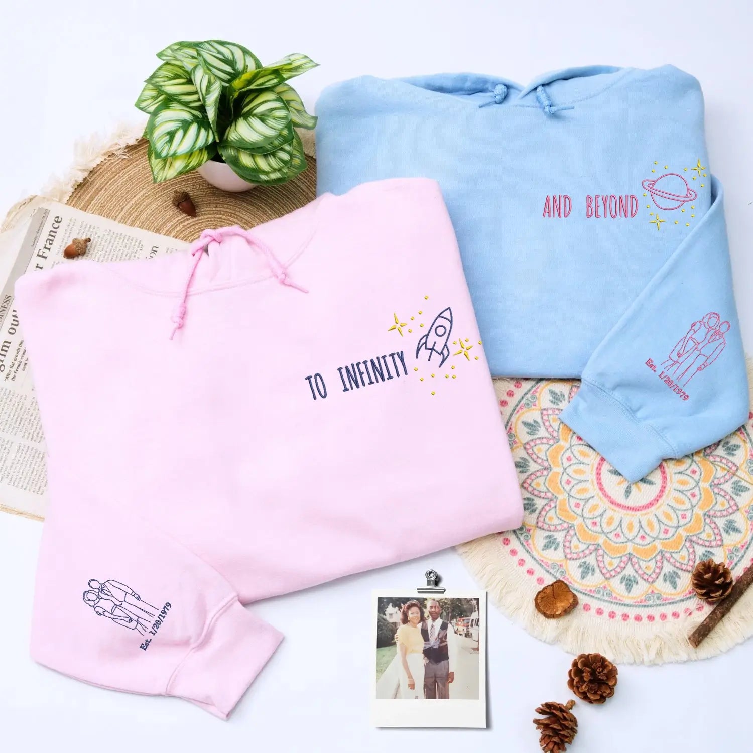 Celebrate your first wedding anniversary with a custom embroidered sweatshirt or hoodie that captures your love story “To Infinity and Beyond.” This personalized piece features a finely stitched couple portrait, turning a simple hoodie into a meaningful keepsake made just for the two of you.